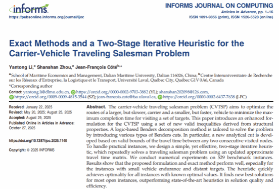 近日,我院李延通副教授作为第一作者的研究成果“Exact Methods and a Two-Stage Iterative Heuristic for the Carrier-Vehicle Traveling Salesman Problem”在管理科学与运筹学UTD24顶级期刊《INFORMS Journal on Computing》在线发表。该研究由李延通副教授、博士生周姗姗与加拿大拉瓦尔大学Jean-François Côte教授合作完成。论文链接://doi.org/10.1287/ijoc.2025.1140。